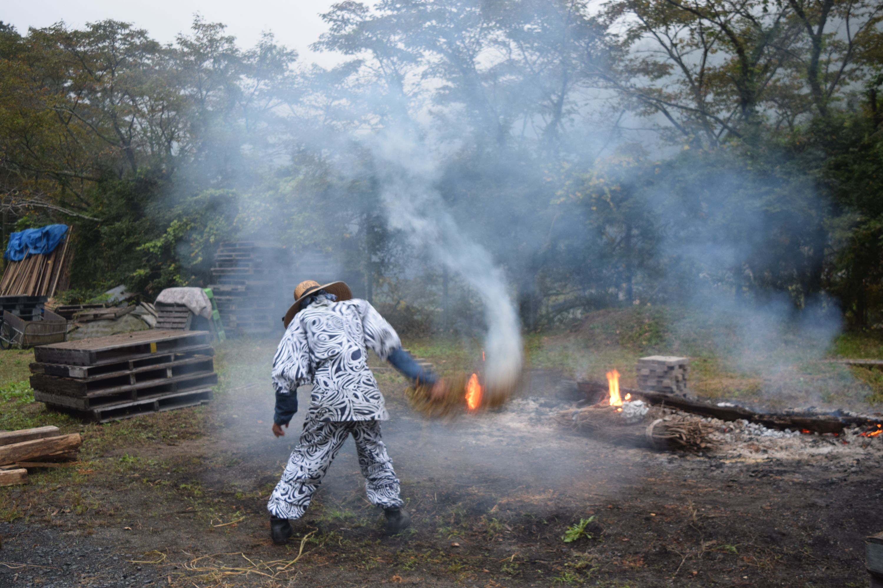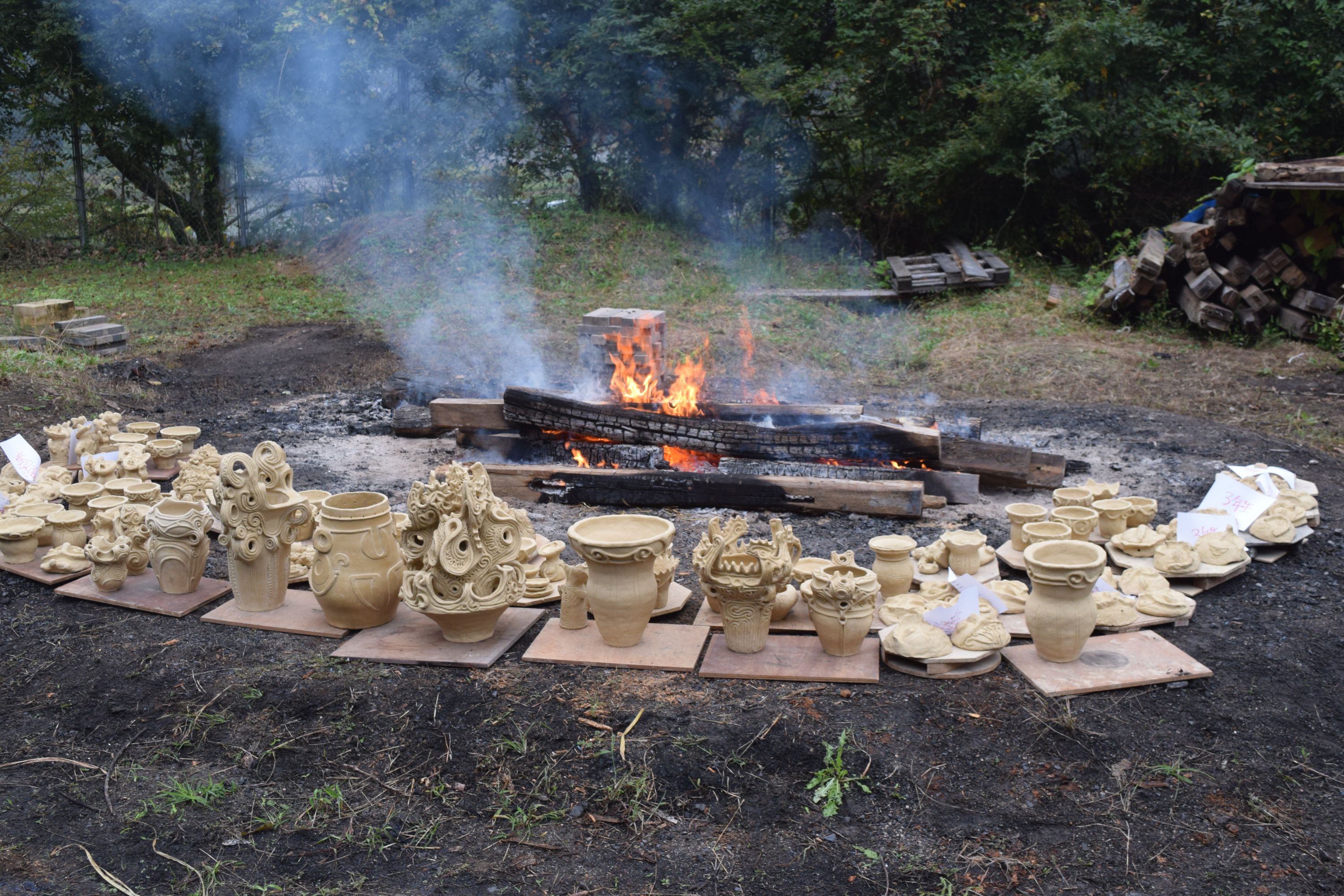 この日は天候の急変を心配して、野炉の中心に早めに作品を据え、周りに火焔陣を作り、徐々に火力を上げていき作品の炙りを慎重に。材木の入れ方、タイミング、炎のサークルの狭め方などを慎重に見極めながら、協力して進めていきます。