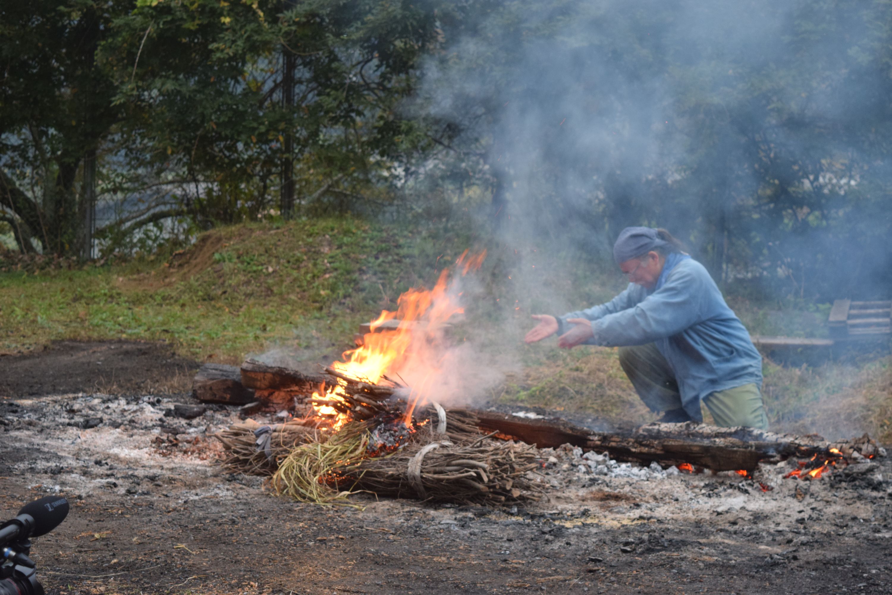 早朝は台風23号の影響が残り、厚い雲に覆われた中で、朝7時火入れ。前日の野炉焼きの火が朝まで微かに残り、火床としてはなかなか良い感じ。縄文野焼き開始です。