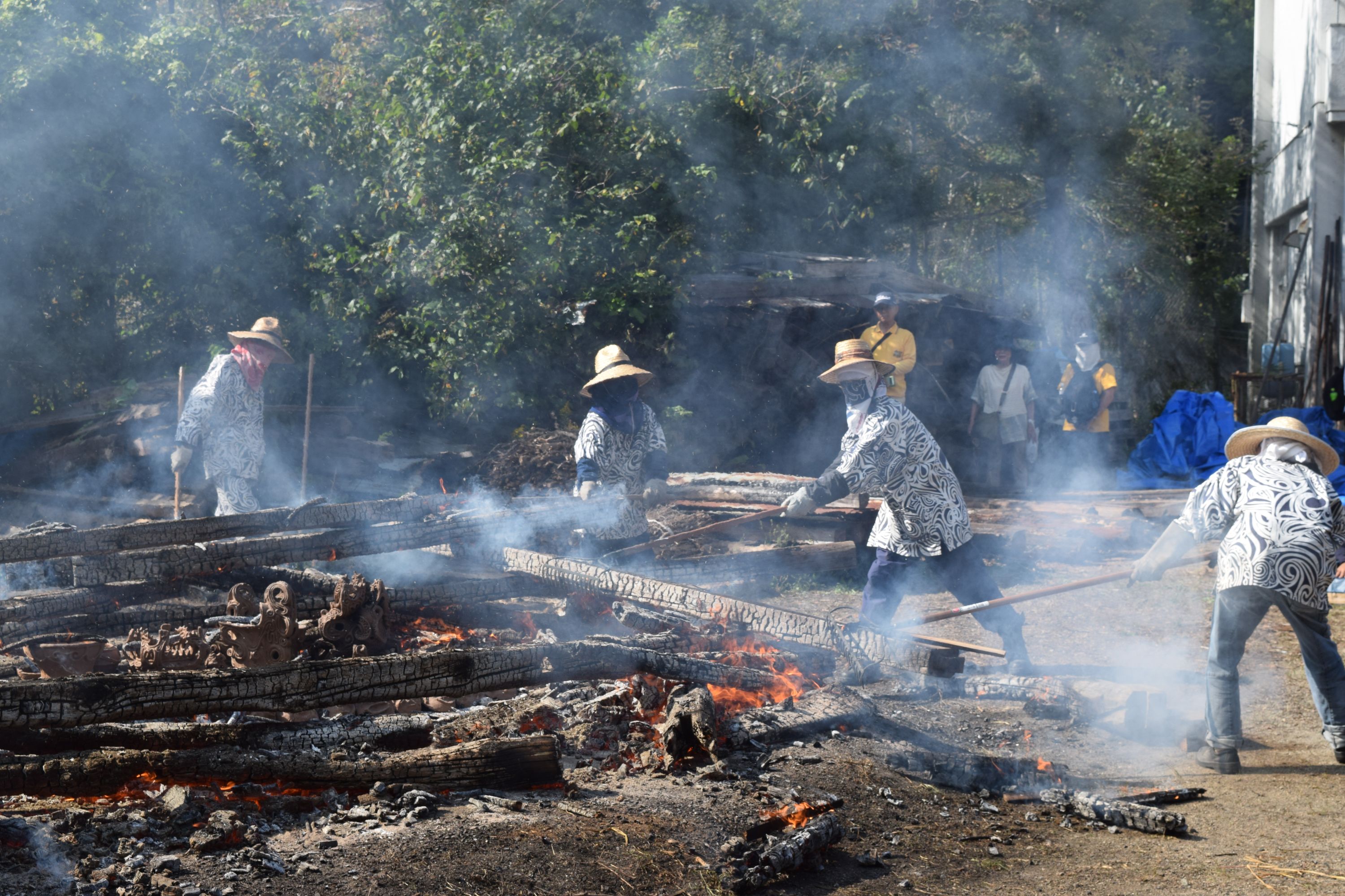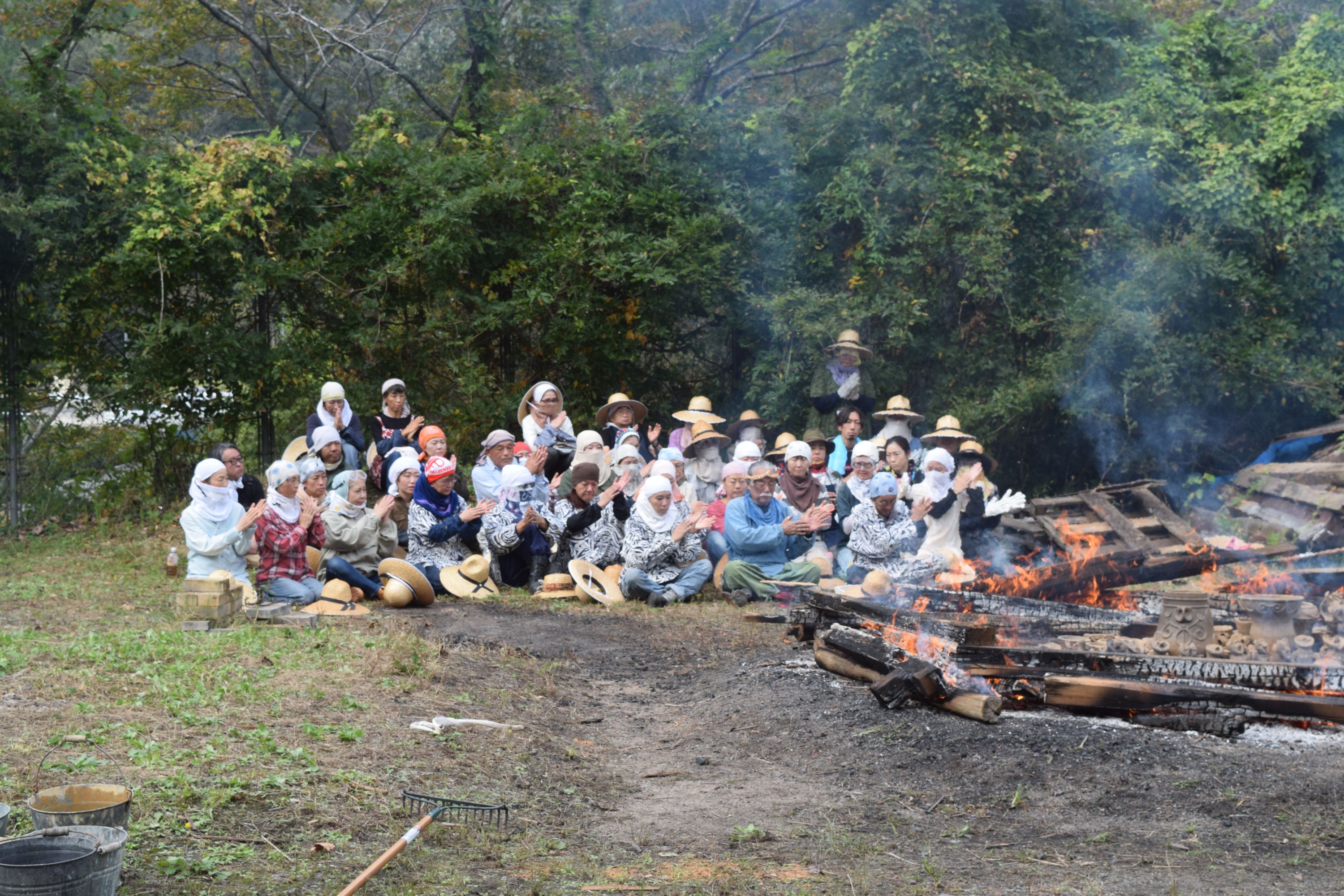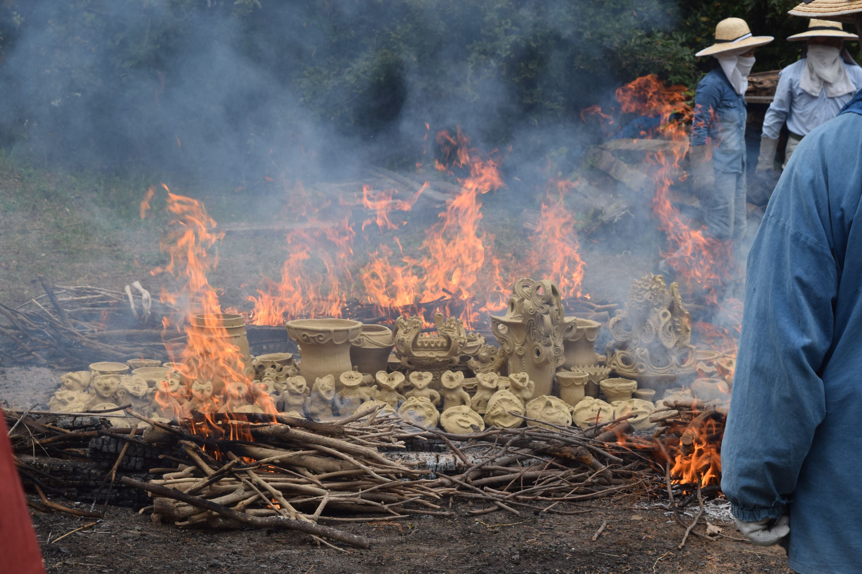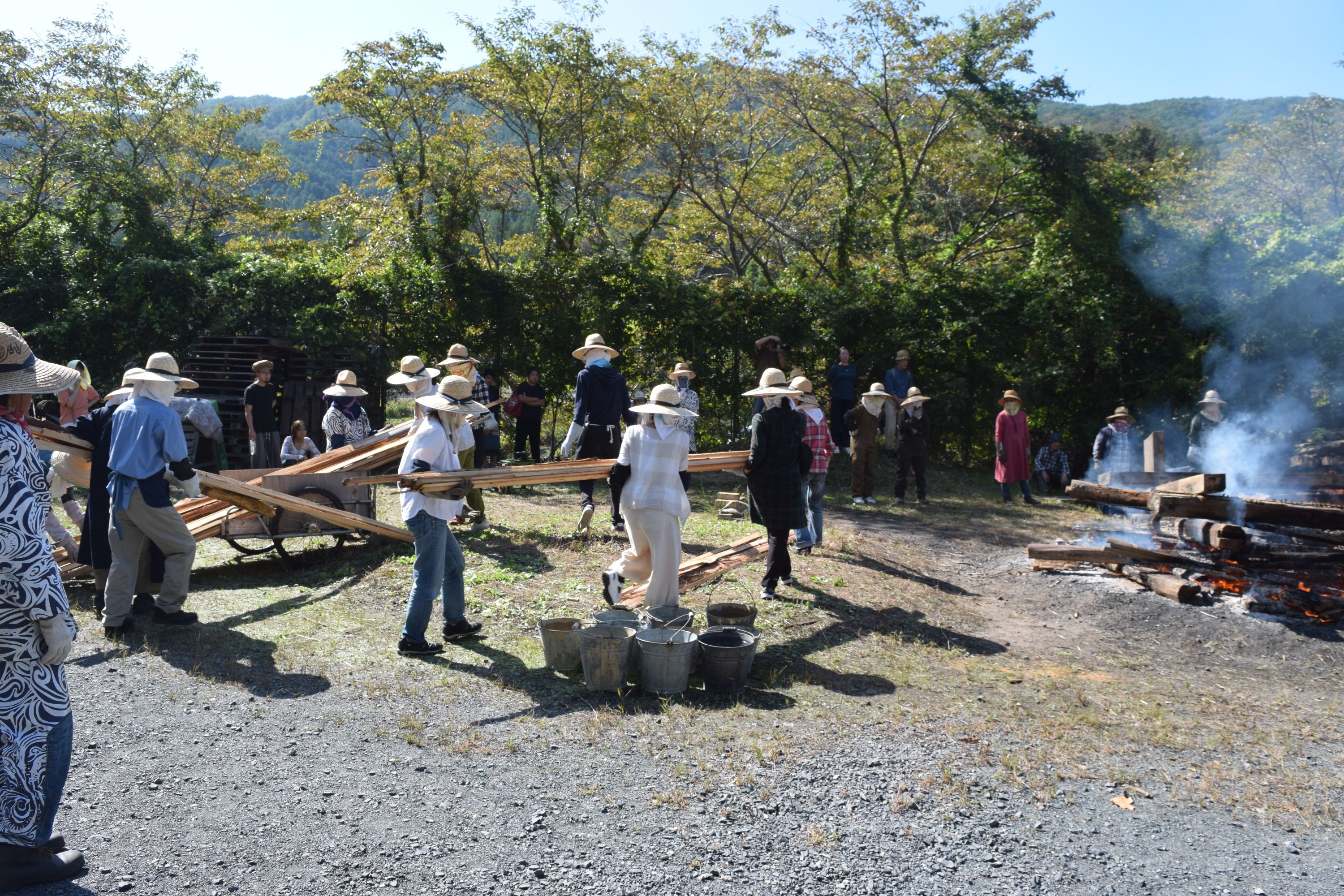 天候も次第に好転し、青空が広がる野焼き日和。作品の色も、温度が上がるほどに黒ずみ始め、濃い茶色に。野焼きスタッフは初めての方も多く、いつもながら女性が多いのですが、大きくて重い材木を3~4人がかりでしっかりと運び配置。日差しが強まり、野焼きの火も大きくなるので、皆汗まみれになりながら力を合わせます。