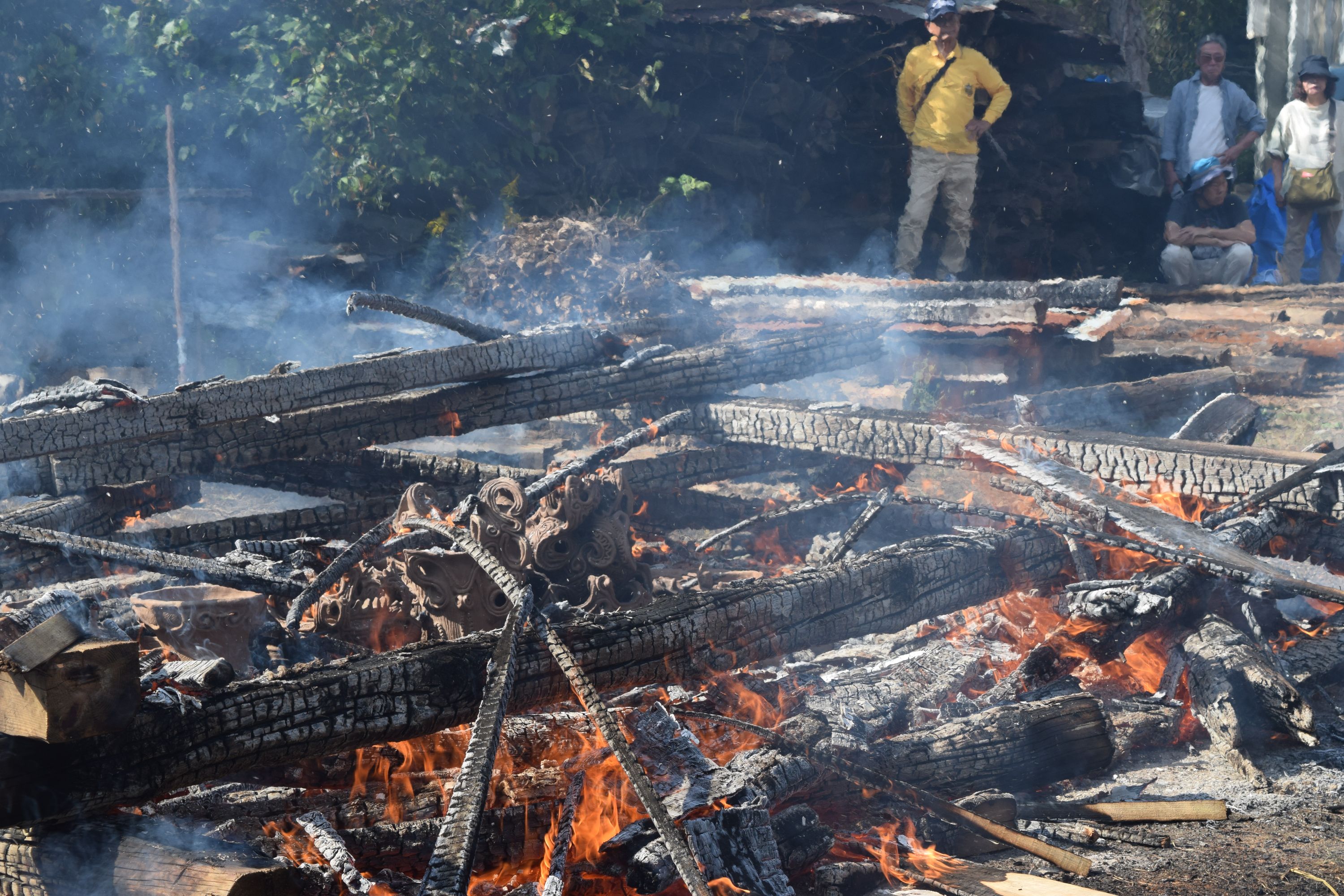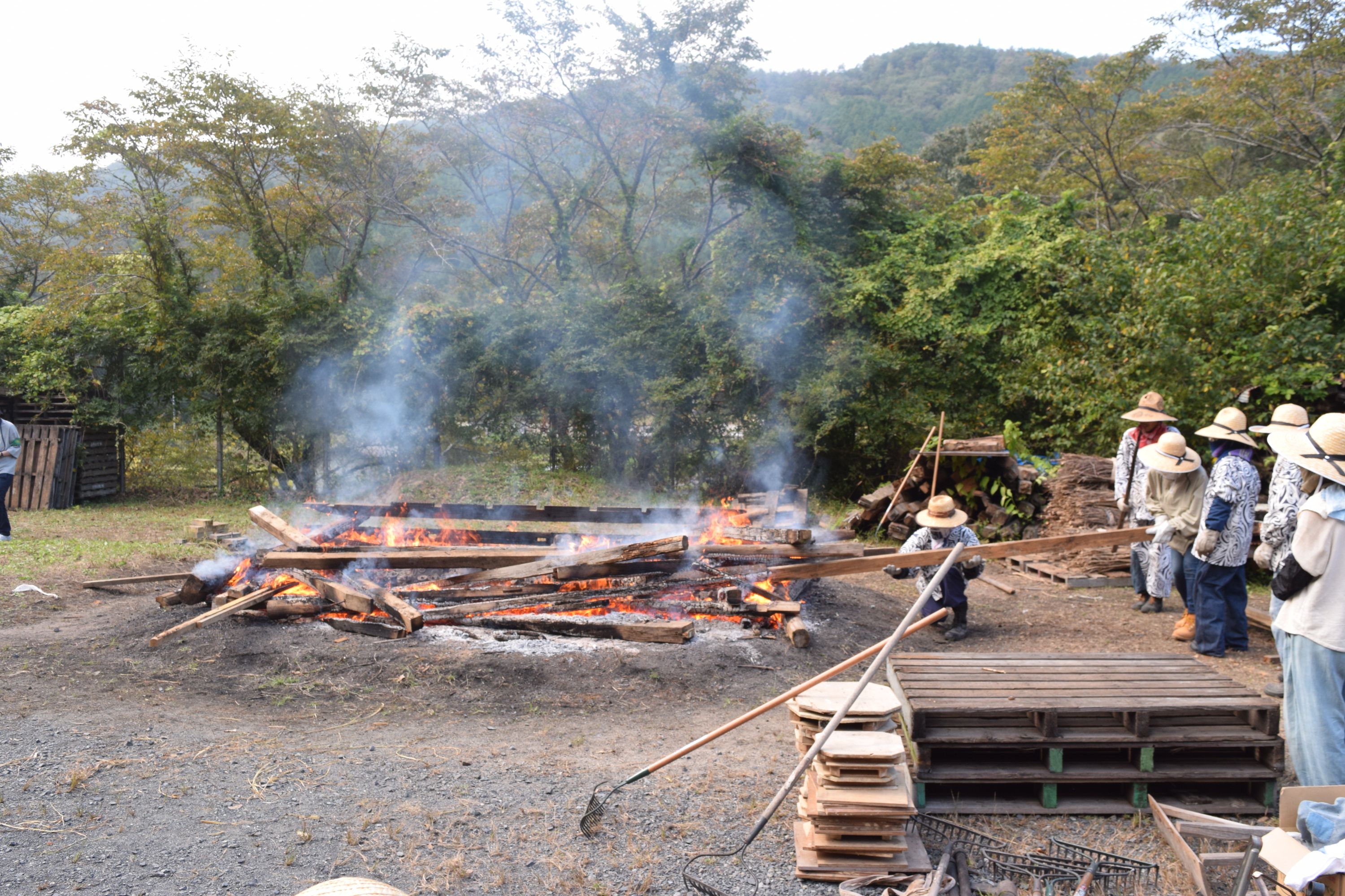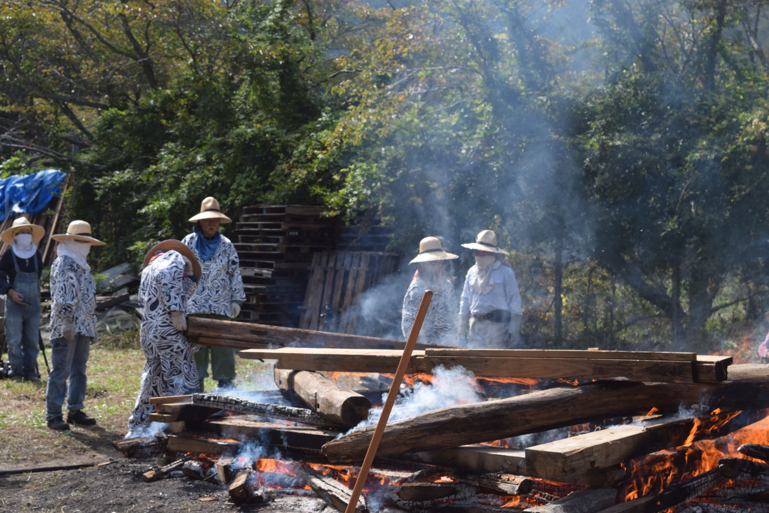 天候も次第に好転し、青空が広がる野焼き日和。作品の色も、温度が上がるほどに黒ずみ始め、濃い茶色に。野焼きスタッフは初めての方も多く、いつもながら女性が多いのですが、大きくて重い材木を3~4人がかりでしっかりと運び配置。日差しが強まり、野焼きの火も大きくなるので、皆汗まみれになりながら力を合わせます。