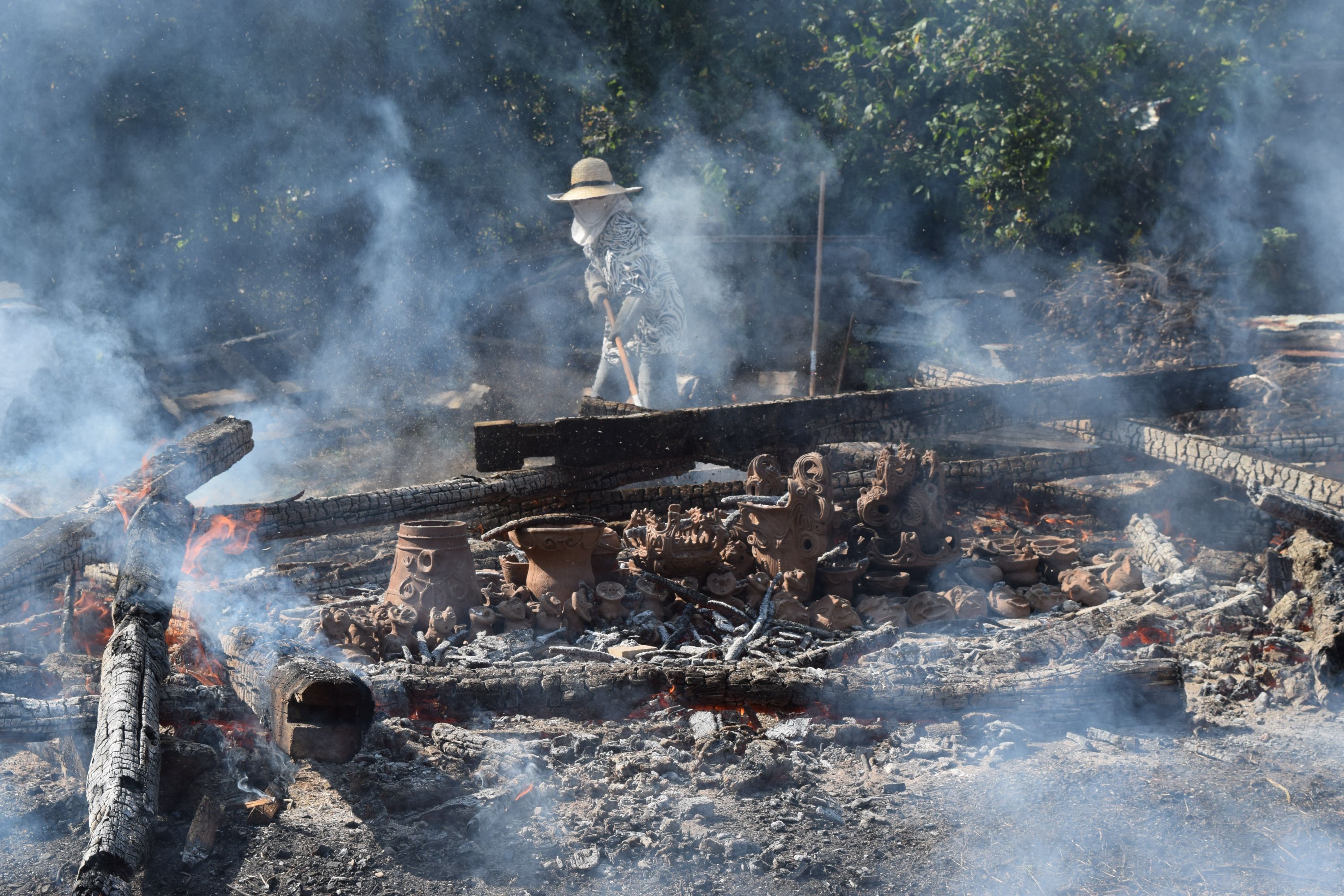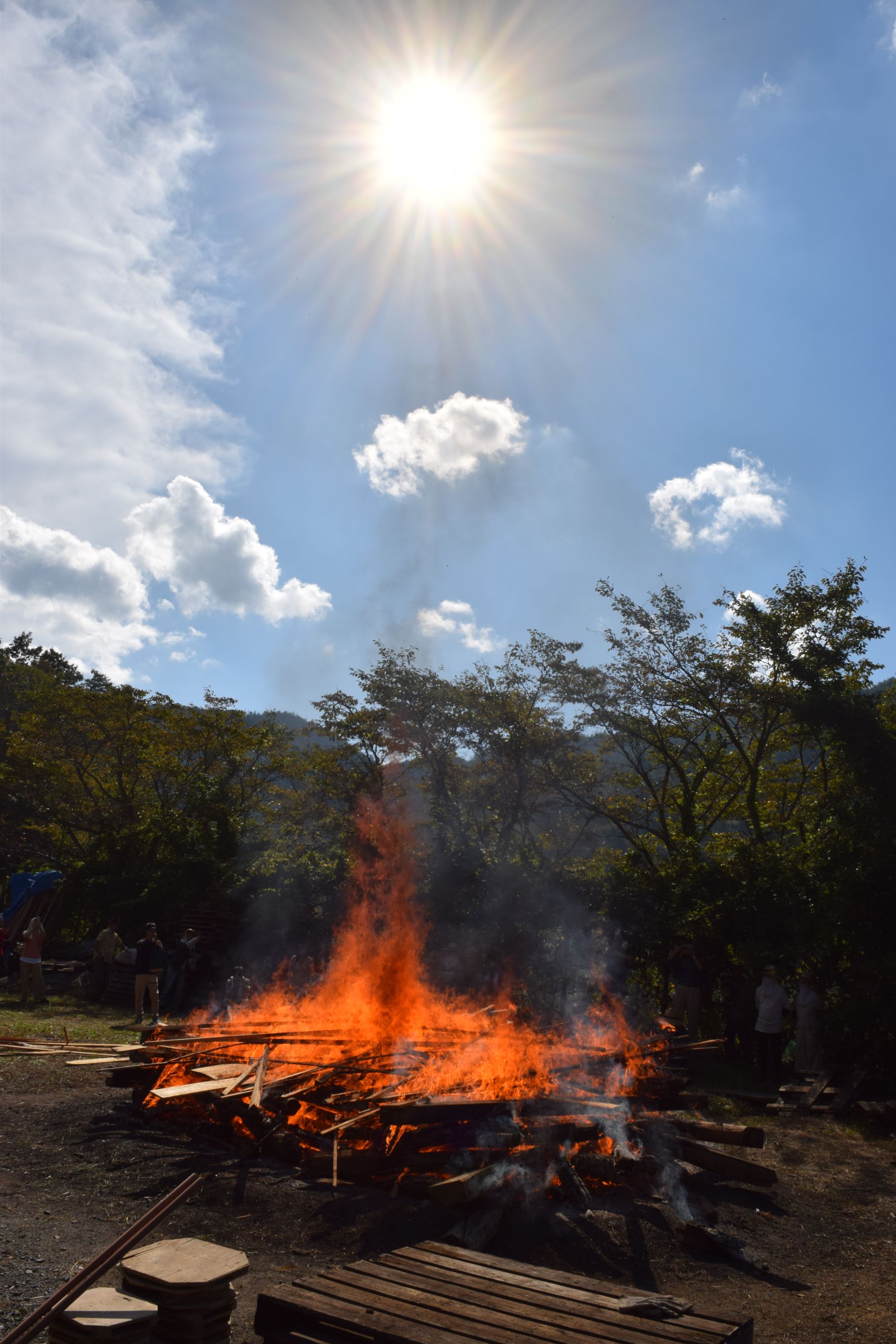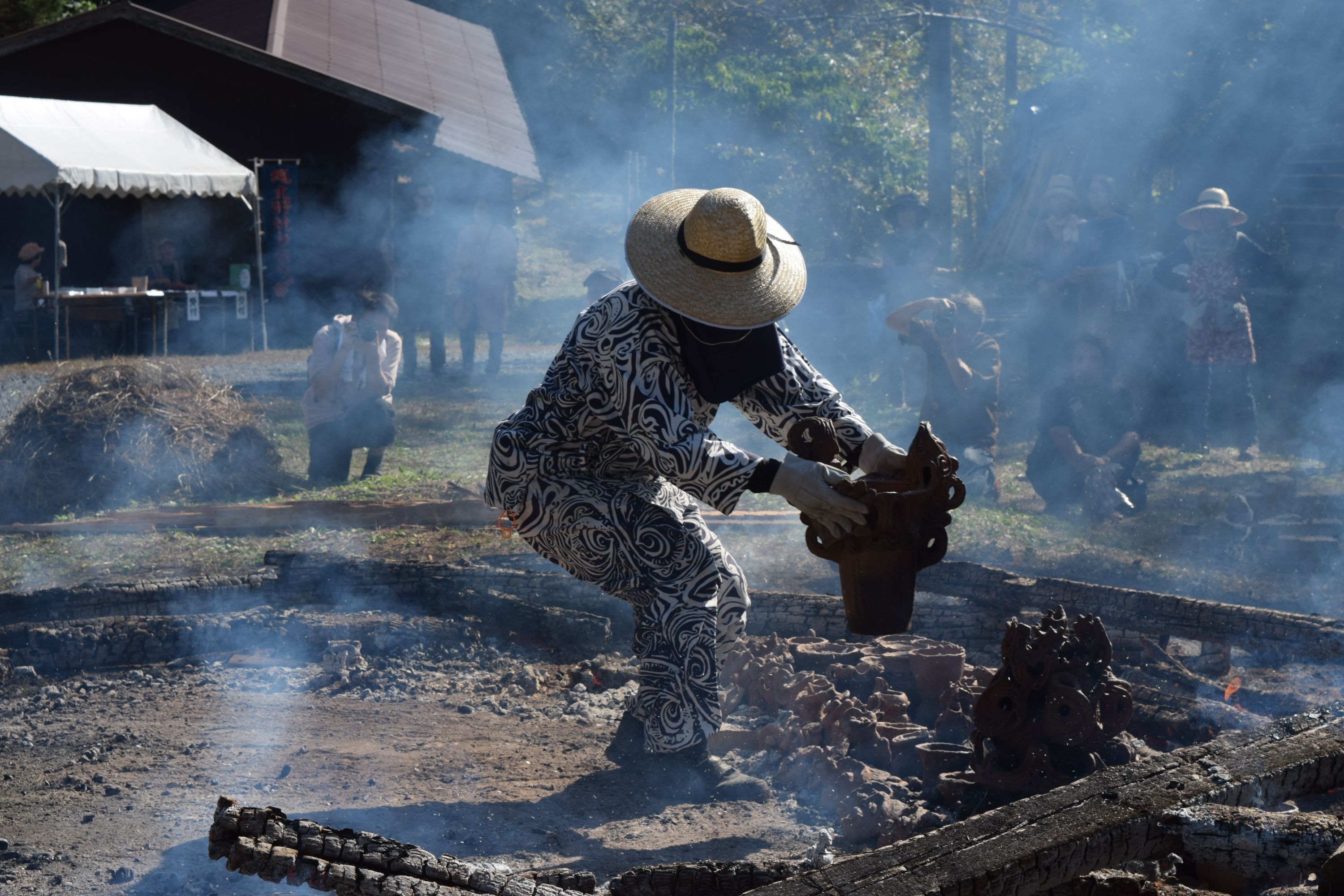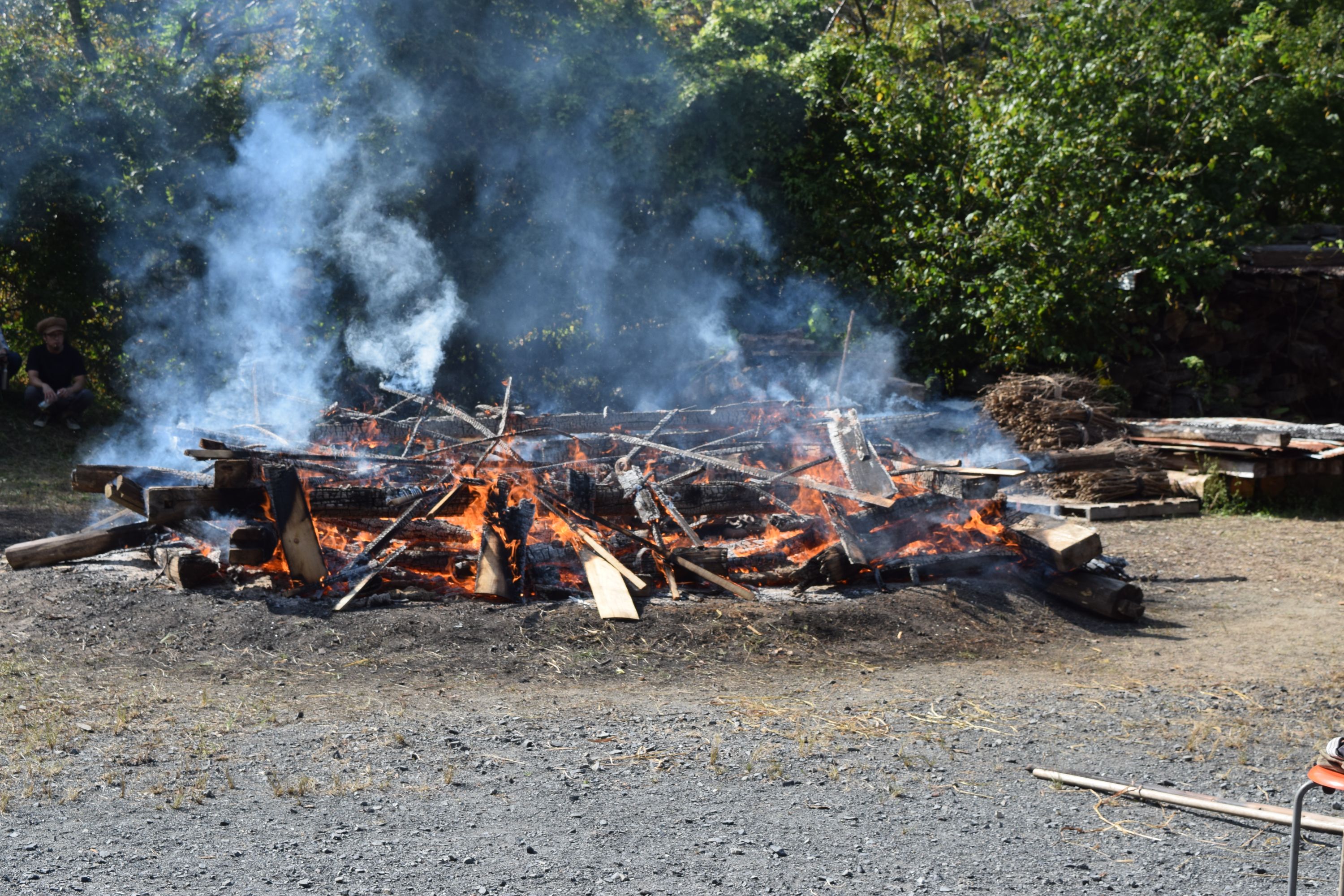 天候も次第に好転し、青空が広がる野焼き日和。作品の色も、温度が上がるほどに黒ずみ始め、濃い茶色に。野焼きスタッフは初めての方も多く、いつもながら女性が多いのですが、大きくて重い材木を3~4人がかりでしっかりと運び配置。日差しが強まり、野焼きの火も大きくなるので、皆汗まみれになりながら力を合わせます。