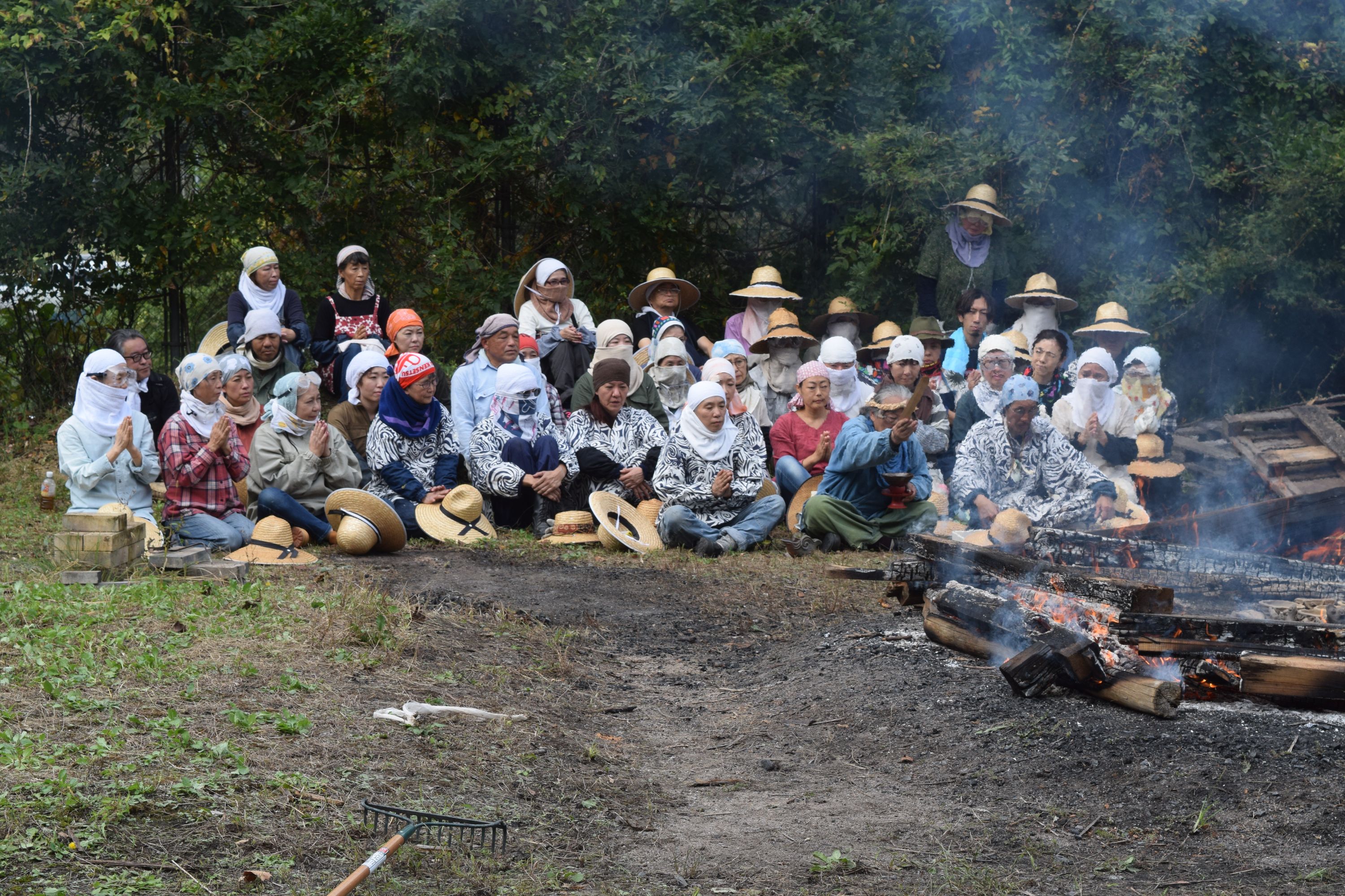 「カムイノミ」では「縄文野焼き」が無事やり遂げられるよう スタッフ全員で野焼きの火を前に、大地や太陽、火や風、森羅万象に祈ります。