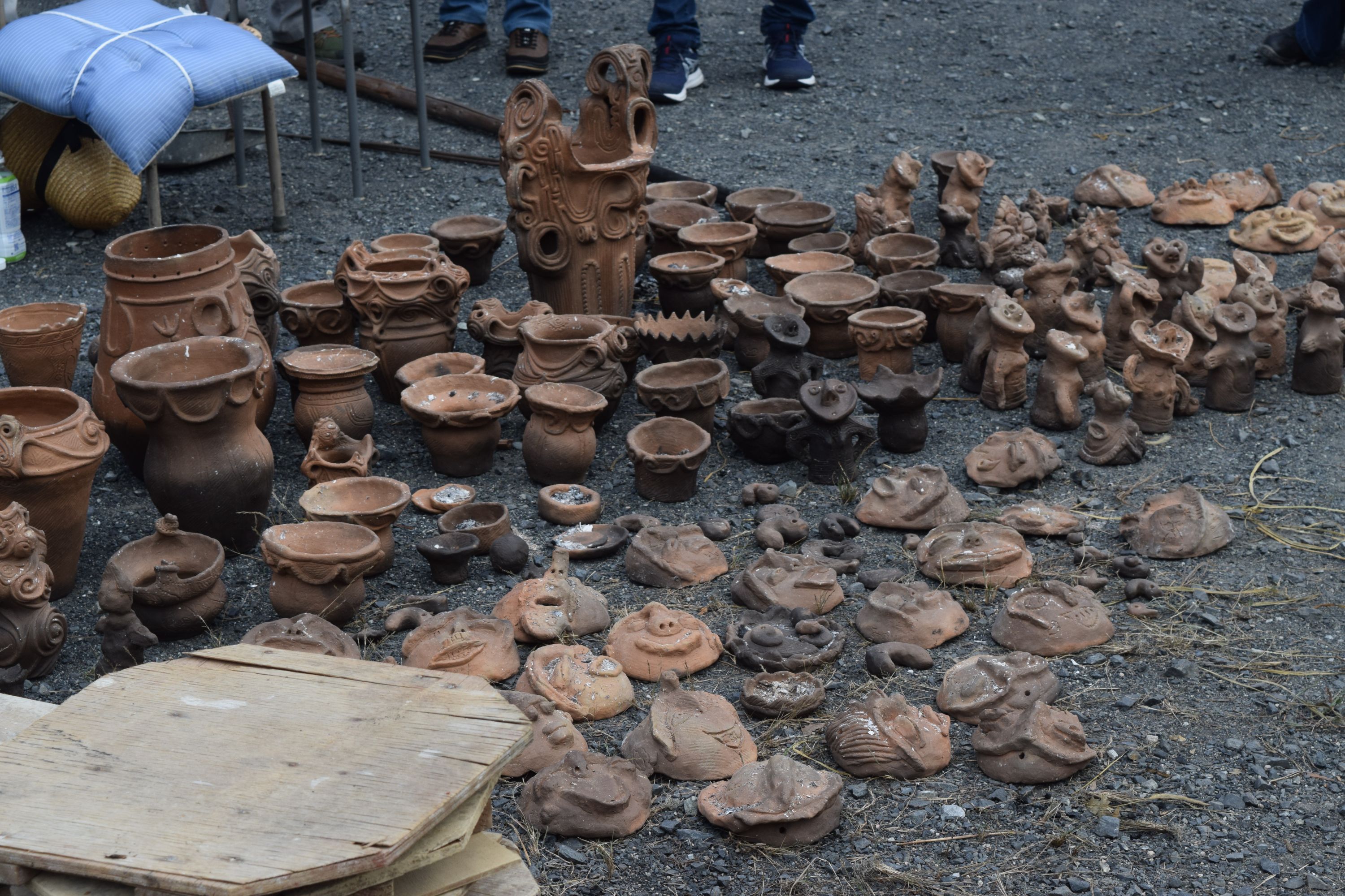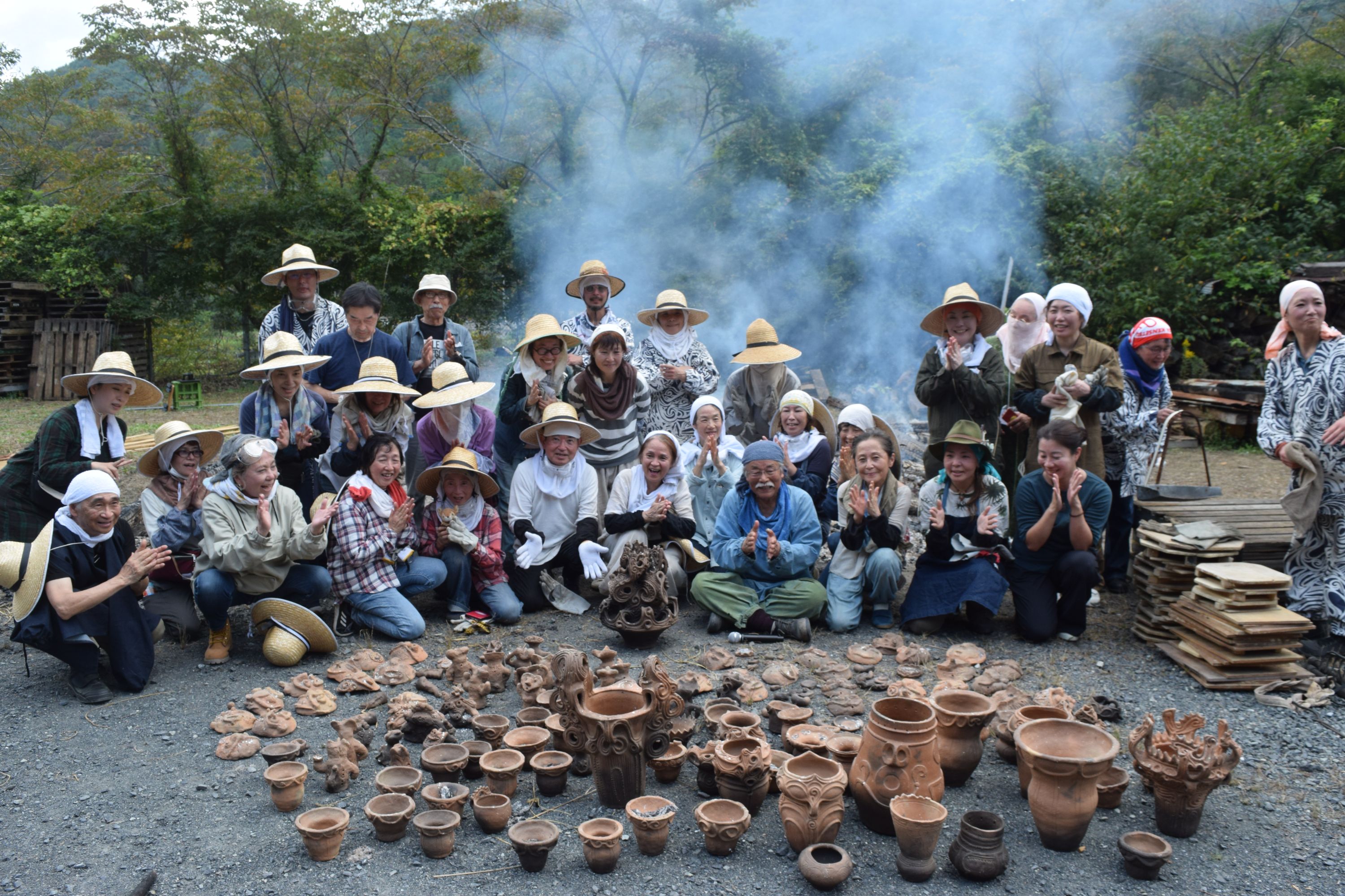 そしてクライマックスの縄文の炎の大きな火柱が立ち昇り、温度も800度越え。炎の子宮から新しい生命の誕生です!縄文土器や土偶、縄文土面やオブジェ、土鈴・勾玉など約150点が無事に焼き上がりました。取り出された作品はみな縄文文様が施され心を込めてつくった素晴らしい作品たち、縄文の魂に触れた命への祈りがこめられ、炎のパワーを宿し輝いています。