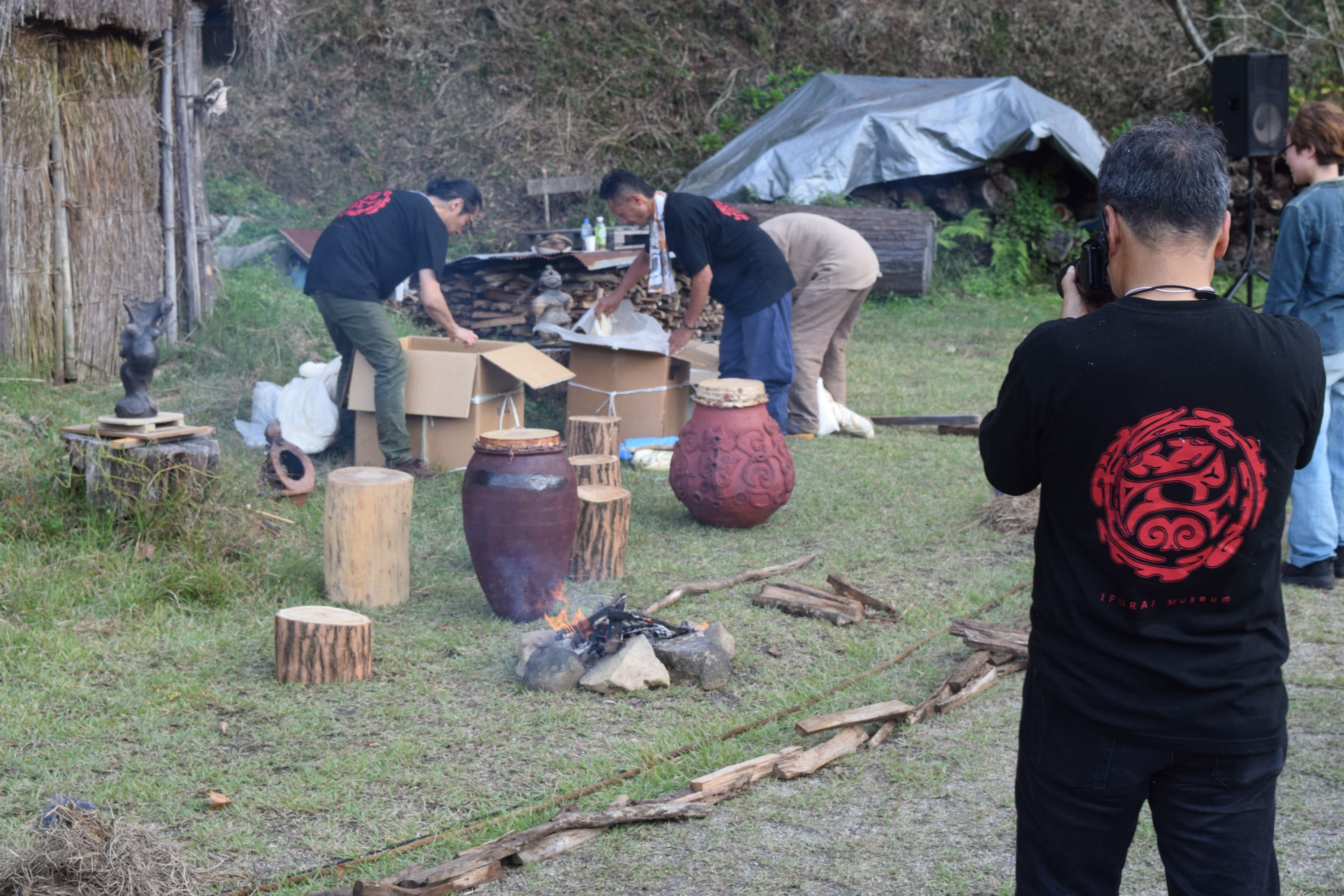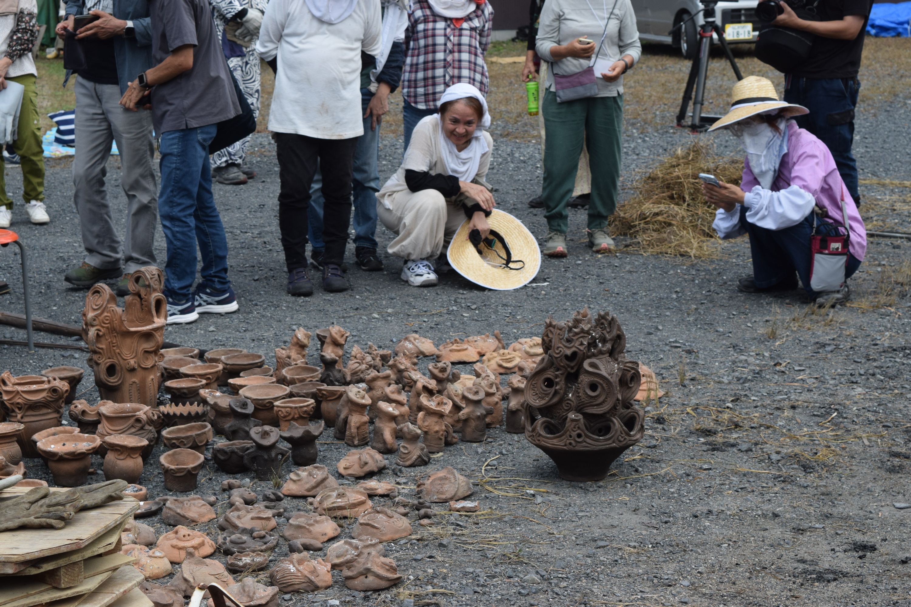 当日の野焼きスタッフは40人以上。京都・奈良・大阪・兵庫など関西方面、四国、広島・鳥取・島根そして岡山など中国地方からやって来た方々など。作品つくり・縄文野焼きを通して体験することで、縄文の心と技を学びたいと思う人たちが増えています。この日は見学でしたが、フランスから来た若い女性アーティストも。