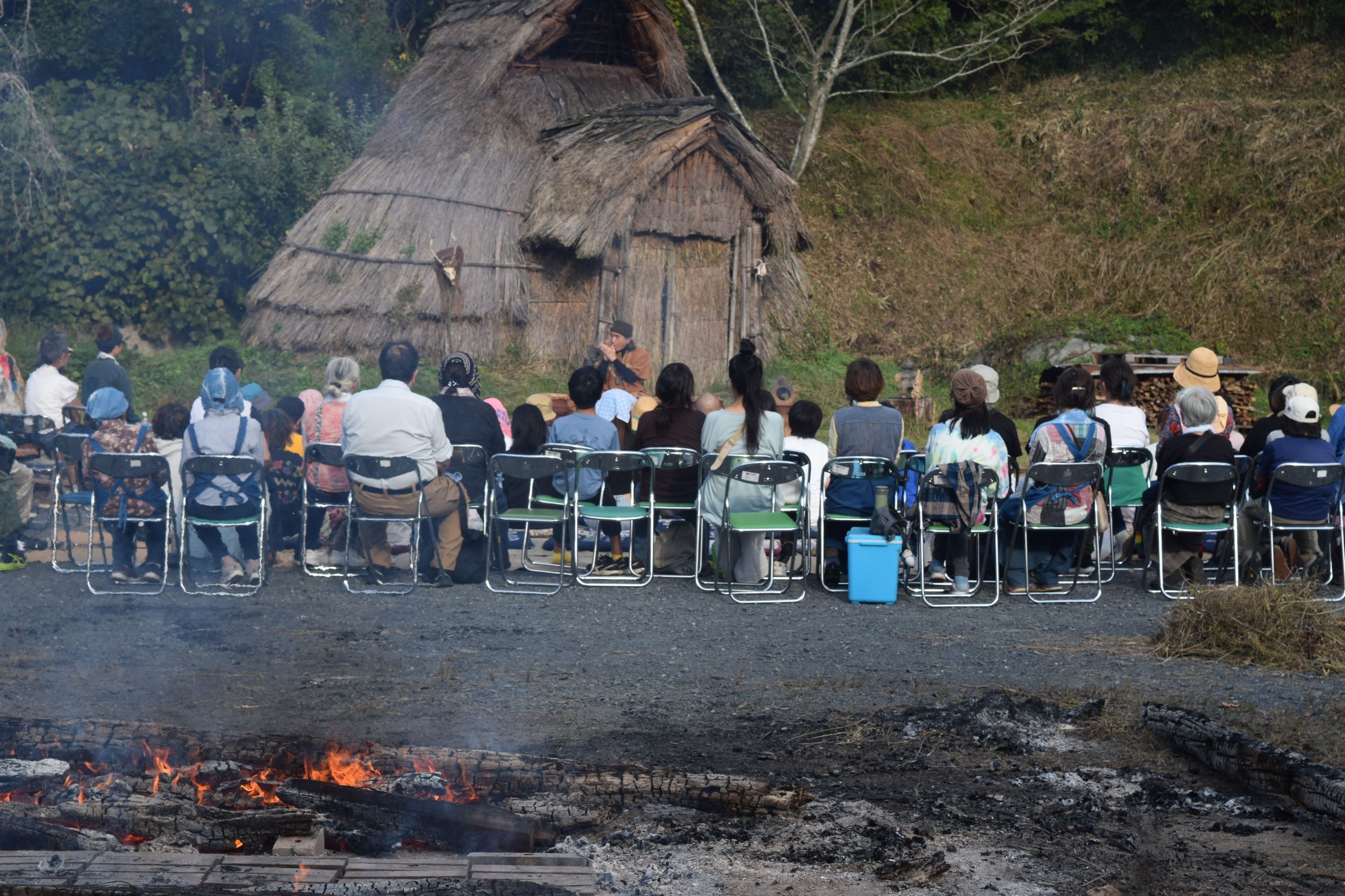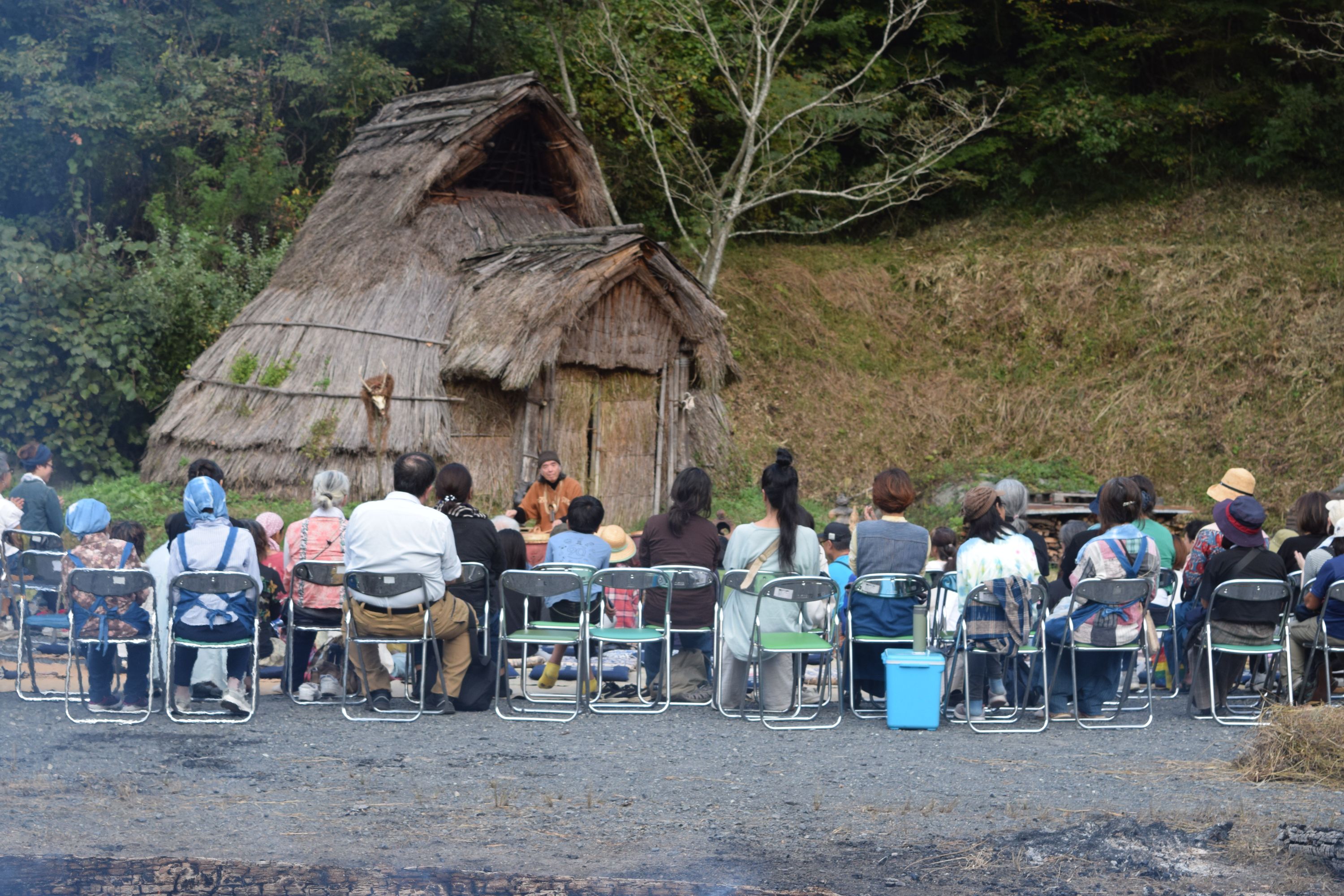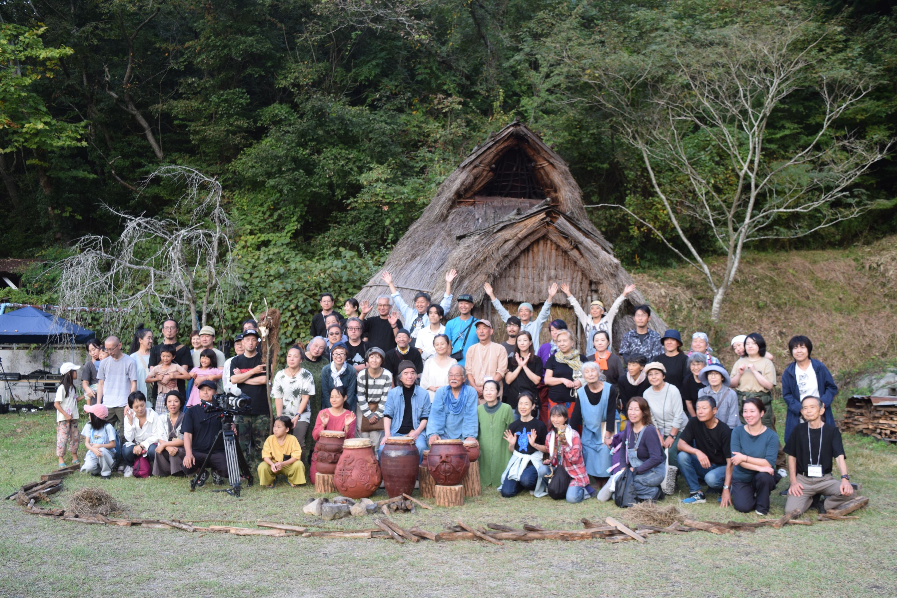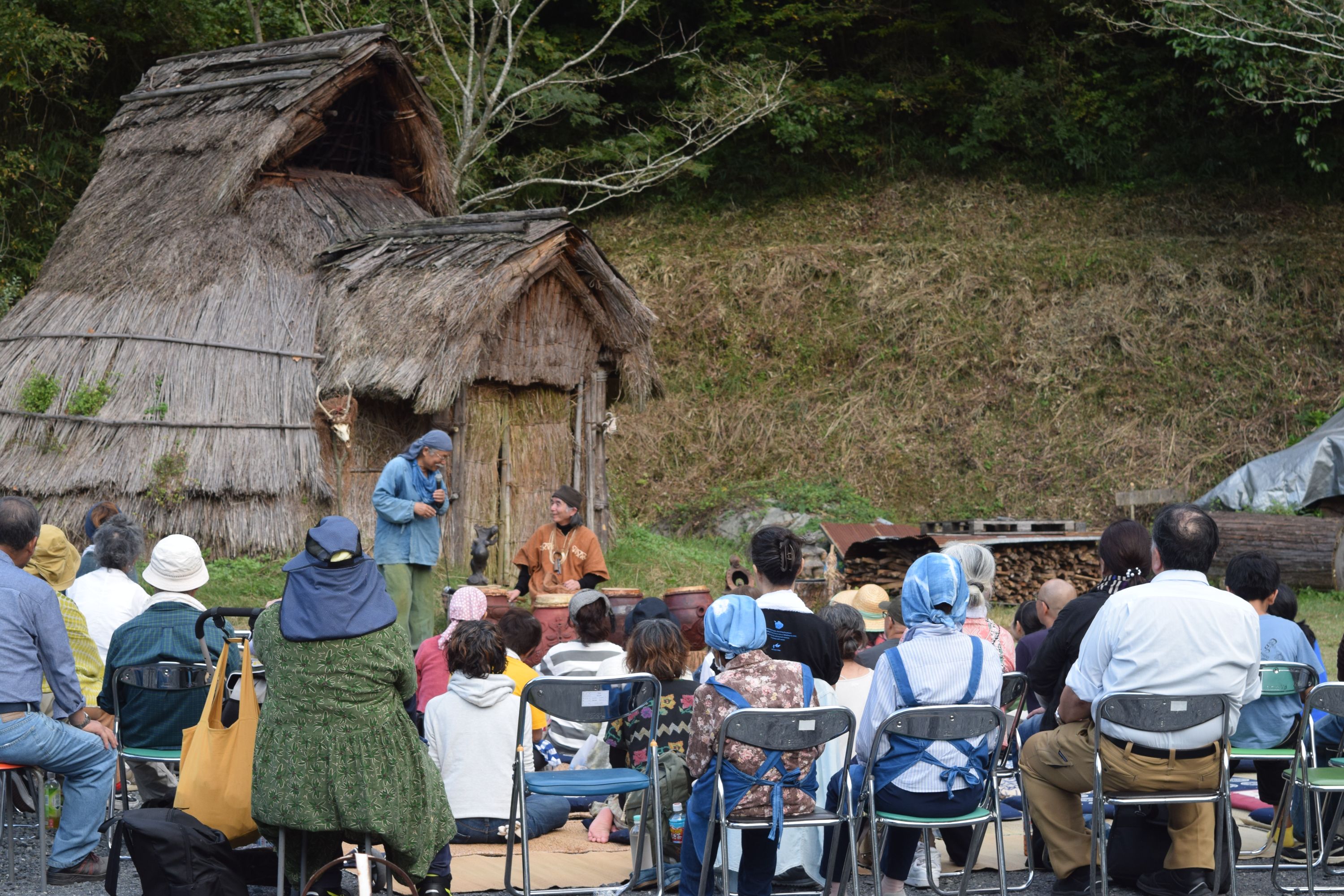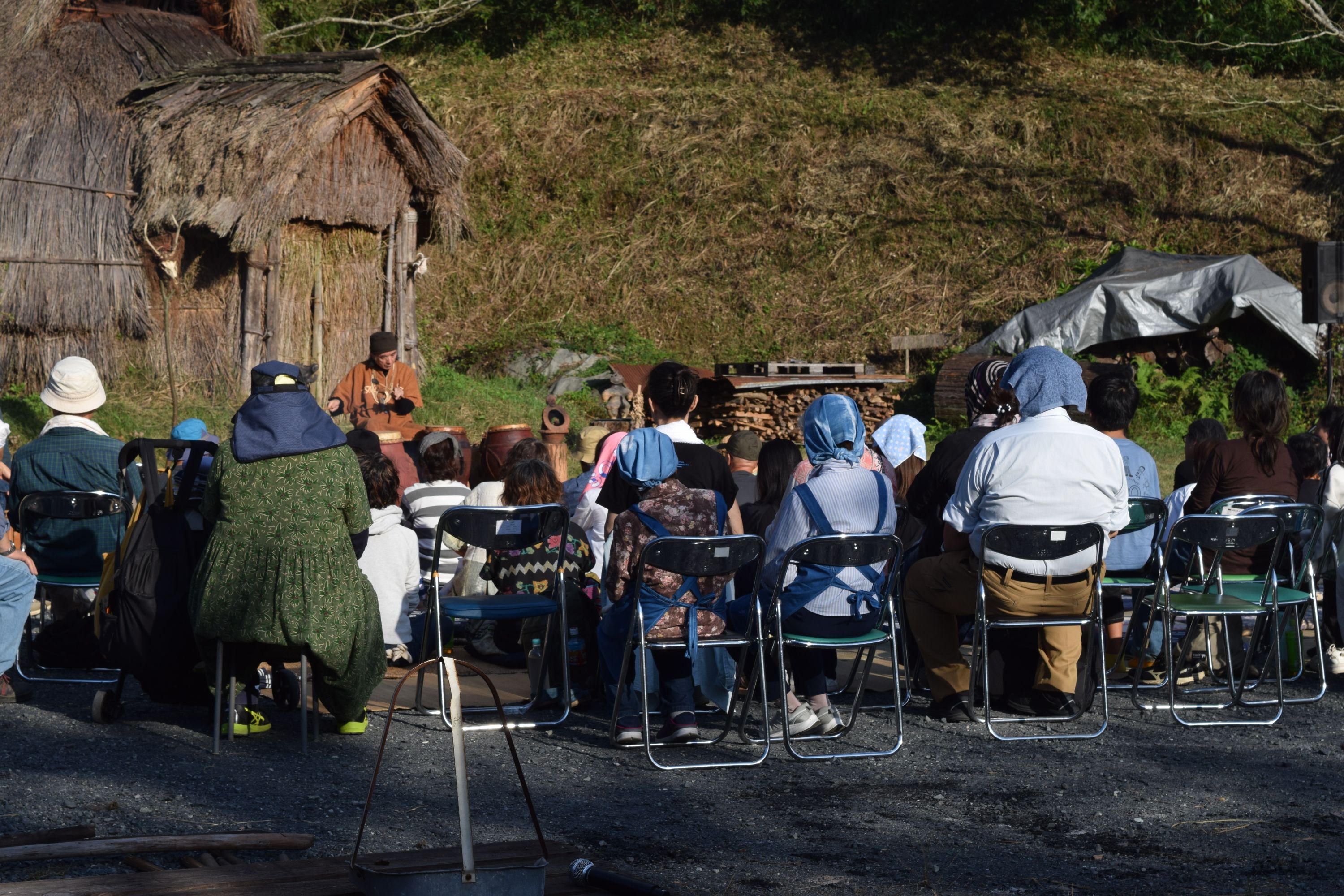 竪穴住居前を舞台に、小さな火を焚き、縄文鼓6個を配置する。土取利行さんが現れてその前に座る。ライブの始まりです。縄文笛の大気を震わす音で始まる。鳥や獣へ語り掛けるような響きには、カラスも呼応して鳴きながら空に弧を描く。縄文鼓の音が、広場と深い緑の谷間に、日の没する山の稜線から空に響き渡る!縄文の音は、縄文鼓の音は大地の鼓動そのもの。縄文の炎の熱のこもる大地を這い、緩やかならせんを描きながら樹々を巡り、空に拡散していく。